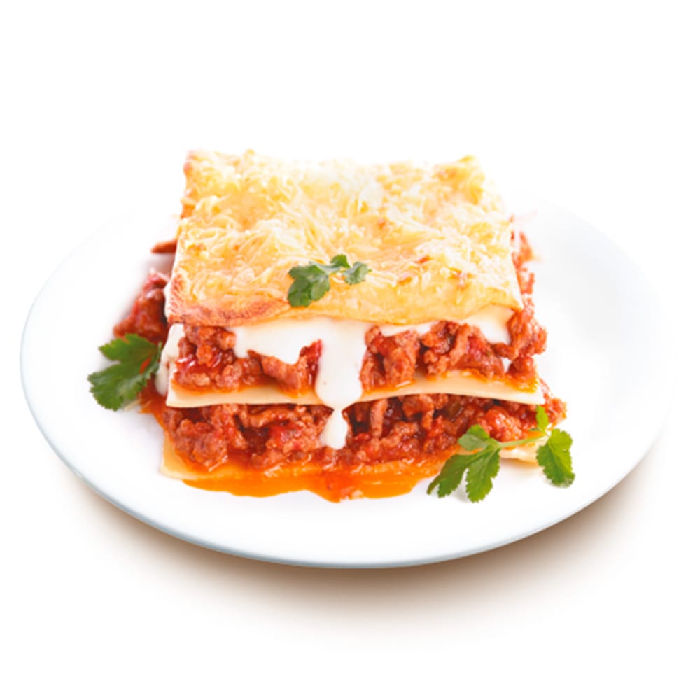 Tiefgekühlte gastronomische Zubereitung auf Basis von Bolognesesauce und frischen, vorgekochten Eiernudeln. (Art. Nr. 13404) – Zutaten: Béchamel [Milch, Wasser, Bechamelzubereitung (modifizierte Stärke, Milcheiweiß, Maltodextrin, Butterpulver, Mono- und Diglyceride von Speisefettsäuren, Salz), Vollmilchpulver, geriebener Käse (Milch, Salz, Lab, Konservierungsmittel: Ei-Lysozym), Olivenöl, Maisstärke, Meersalz, schwarzer Pfeffer, Muskatnuss], Bolognesesauce 32% [Tomatenmark (Tomate, Säureregulator: Zitronensäure), Rinderhackfleisch, Zwiebel, Karotte, Tomatenkonzentrat, Sellerie, Lauch, Sonnenblumenöl, Olivenöl, Meersalz, Zucker, Gewürze und Kräuter], frische vorgekochte Eiernudeln 24% (Hartweizengrieß, vollpasteurisierte Eier 20%, Wasser, jodiertes Salz, Olivenöl), geriebener Käse (Milch, Salz, Lab, Konservierungsmittel: Ei-Lysozym). Kann Fisch, Weichtiere, Krebstiere, Soja, Schalenfrüchte und Senf enthalten. Nach dem Kochen verzehren. Zubereitung: Schutzfolie und Deckel der Verpackung entfernen. Das noch gefrorene Produkt für ca. 40 Minuten in der Mitte des auf 180° C vorgeheizten Ofen backen. Vor dem Servieren die Lasagne etwas abkühlen lassen.